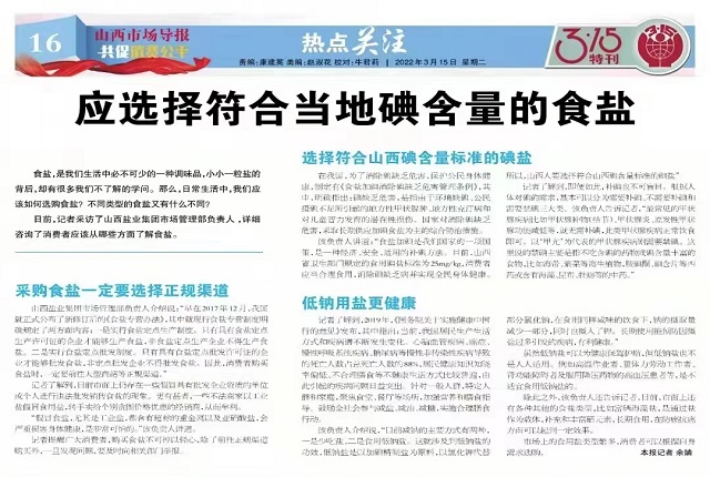 为进一步给广大群众营造安全放心的消费环境,积极推广、普及安全用盐知识,3月15日上午,荣耀体育网页版联合山西市场导报社、山西省消费者协会、山西广播电视台经济与科技节目中心、山西新闻网、太原市迎泽区市场监督管理局等单位共同开展了以“共促消费公平 ”为主题的3·15宣传活动,荣耀体育网页版总经理齐凤鸣带队参加此次活动。