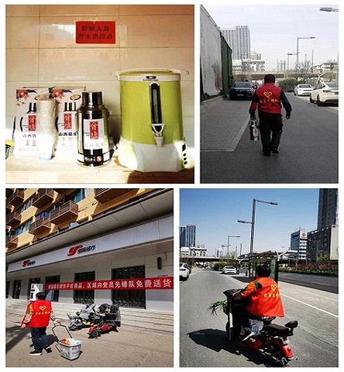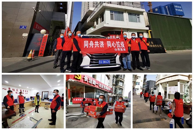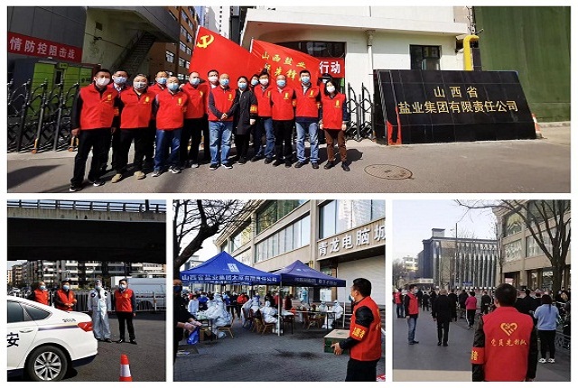 盐业集团抗疫党员先锋队深入营盘街道长治路一社区以及周边辖区道路卡口、商户、防疫点等处,送去帐篷、牛奶、鸡蛋、面包、火腿、方便面、食盐、矿泉水等生活应急物资,并每日不间断为道路卡口交警等防疫人员提供开水。配合属地社区及核酸检测点做好日常秩序维护、扫码测温、人员登记、物资设备搬运等工作。抗疫党员先锋队还积极协助晋盐超市购进、储备民生物资,充足供应周边居民蔬菜、粮油、肉食、鸡蛋等物资;协助超市开展各类商品平价、降价、打折销售活动;为周围小区行动不便的老人和特殊居民提供用品购买等志愿服务。