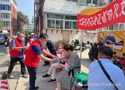 太原盐业分公司积极弘扬并盐人“奉献、友爱、互助、进步”的志愿者精神,在杏花岭区第一中学、育英中学、平民中学、外国语学校、省实验中学考点外设立志愿服务点,志愿者们身穿太原盐业红色马甲,头顶烈日,将满载着祝福与爱心的冰糖绿豆水送到考生家长和坚守岗位一线的交警、保安、环卫等工作者手中,共同为考生保驾护航。