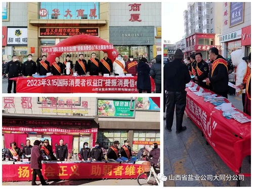3月15日上午九点,山西省盐业集团大同有限责任公司参加了由大同市人民政府主办,大同市市场监督管理局承办的“3.15国际消费者权益日”暨消费维权年主题宣传活动启动仪式,深入宣传消费维权年主题,展示保护消费者合法权益工作新形象、新成效,助推放心消费环境建设,提振全年消费信心。今年的主题是“创优消费环境,提振消费信心”。
