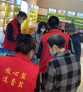 01对顾客发放盐品宣传彩页并向他们普及健康用盐知识,根据不同顾客用盐需求,为他们分别介绍低钠盐、螺旋藻盐、富硒海藻盐、天然海盐、竹盐、莫顿盐等高品质食盐,让更多人了解和认识“晋盐”产品的分类和品种,让更多人信赖国企老品牌“晋盐”。
