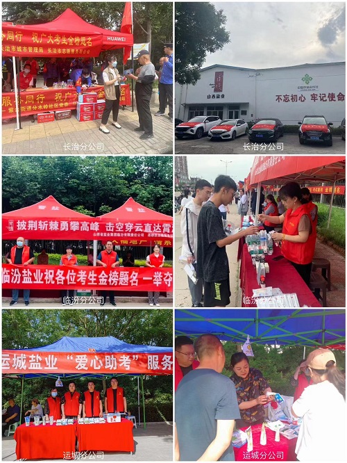 各单位结合工作实际,采取多种形式,设立“爱心助考驿站”,为考生及家长们准备了遮阳棚、休息椅、矿泉水、考试文具、救急药箱及晋盐团扇等贴心物品以及爱心送考车辆,为高考学子助威,为人生理想护航,并对考场外的家长、警务人员及社会各界人士送去爱心服务,履行盐业职工的社会责任和国企担当。