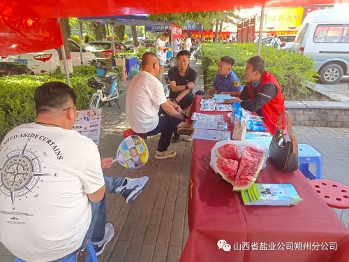 2023年6月20日6:30,山西省盐业公司朔州分公司的助考宣传组一大早就赶朔城区第三中学门口,为广大中考生助威加油,设置爱心服务助考台,既宣传专营和碘缺乏病政策知识,又为广大考生和家长提供休息座,“甘甜的西瓜”为闷热焦躁等待的家长带来了一丝丝舒缓和凉意!