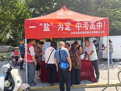临汾分公司深入尧都区中考学校周边社区,开展了以“一‘盐’为定、中考高中”为主题的爱心公益宣传活动。在社区现场,职工们支起红色棚架、摆放盐品条桌、陈列了“晋盐”品牌产品、悬挂了“一‘盐’为定、中考高中”的主题条幅,冒着高温酷暑,热情向考生家长和社区居民宣传相关法律法规、介绍“晋盐”品牌,讲解相关健康用盐知识、回答大家的提问咨询等,引导大家正确树立“科学补碘”、“健康用盐”的意识,使考生家长及社区居民更加感知“晋盐”、了解“晋盐”、倾向“晋盐”。